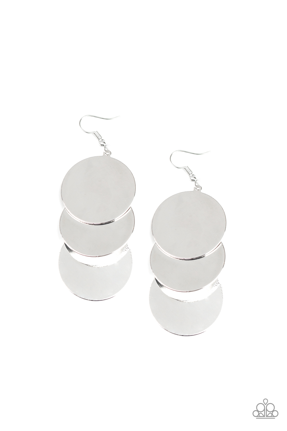Brushed in a high sheen shimmer, delicately scratched silver discs cascade from the ear, coalescing into a blinding lure. Earring attaches to a standard fishhook fitting.
