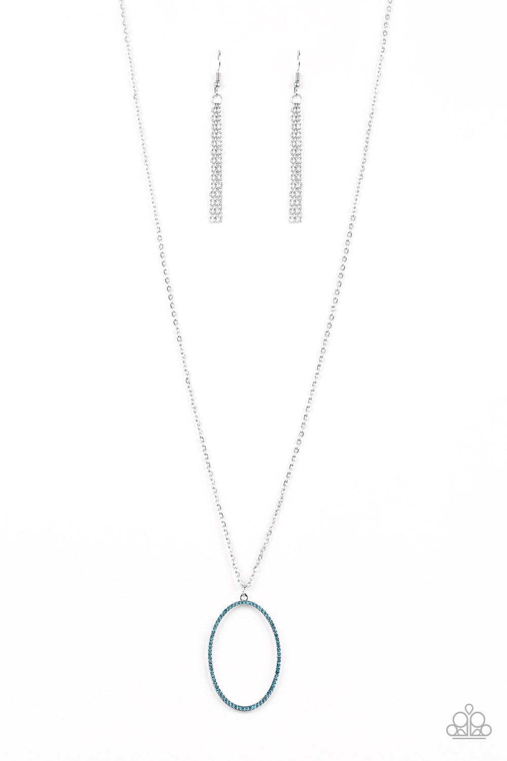 Encrusted in glassy blue rhinestones, an airy silver hoop swings from the bottom of a lengthened silver chain for a refined flair. Features an adjustable clasp closure.