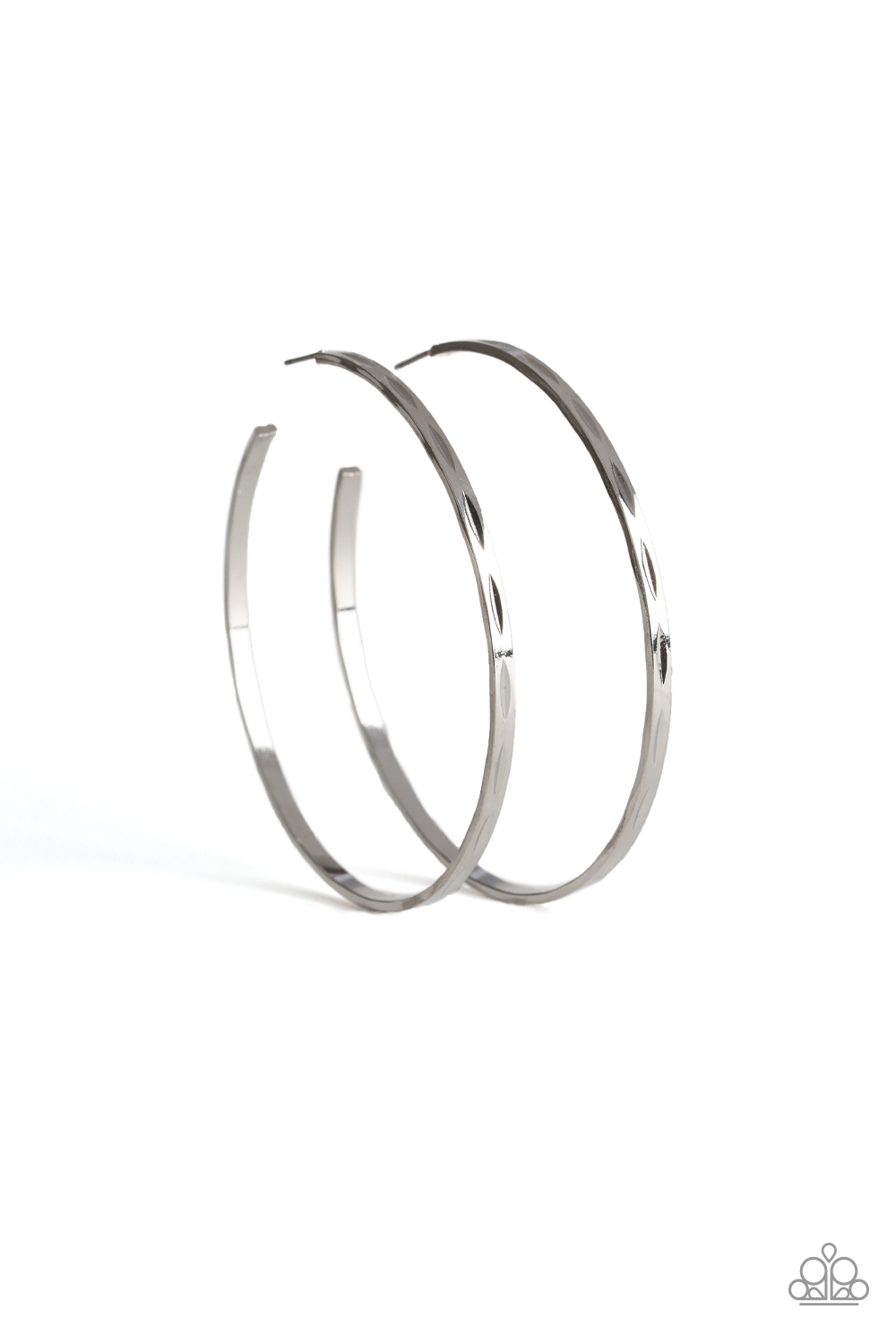 Featuring a high-sheen silver finish, a skinny hoop is stamped in a faceted pattern for an edgy look. Earring attaches to a standard post fitting. Hoop measures approximately 2 3/4" in diameter.
