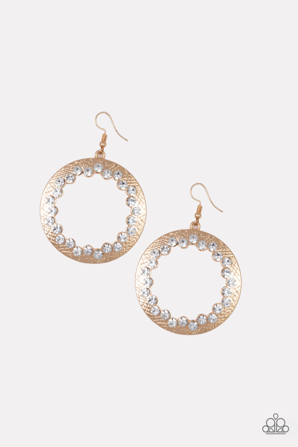 Glittery white rhinestones are encrusted haphazardly along the center of a glistening gold hoop radiating with scratched shimmer for a refined look. Earring attaches to a standard fishhook fitting.