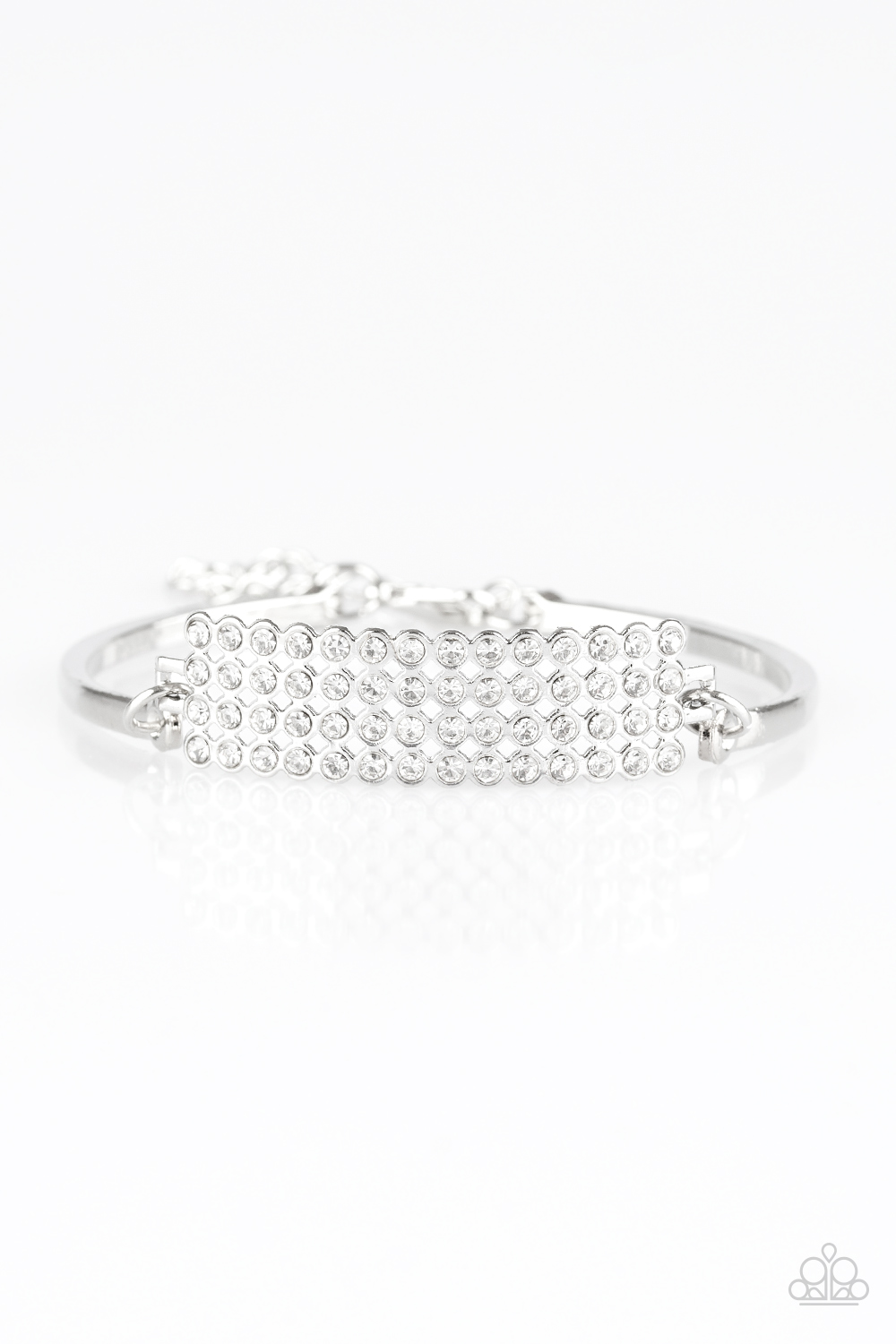 Row after row of glassy white rhinestones stack into a gorgeous rectangular pendant. Attached to two arcing silver bars, the glittery pendant sits atop the wrist for an undeniably glamorous look. Features an adjustable clasp closure.
