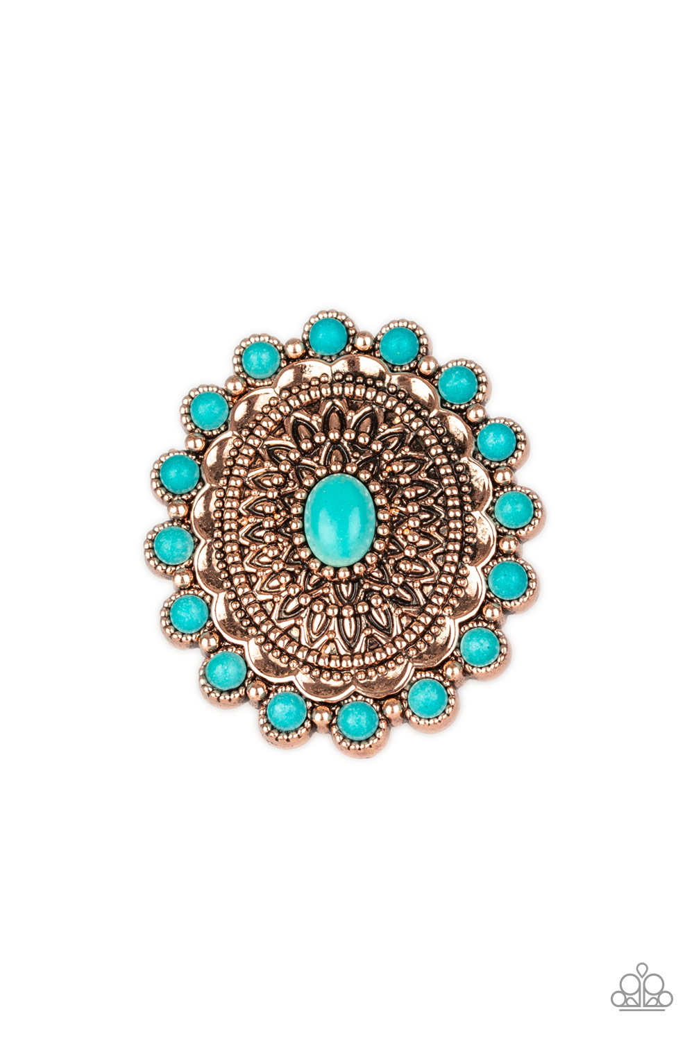 Embossed in dizzying floral details, a shimmery copper frame is dotted with refreshing turquoise stone accents for a seasonal look. Features a stretchy band for a flexible fit.