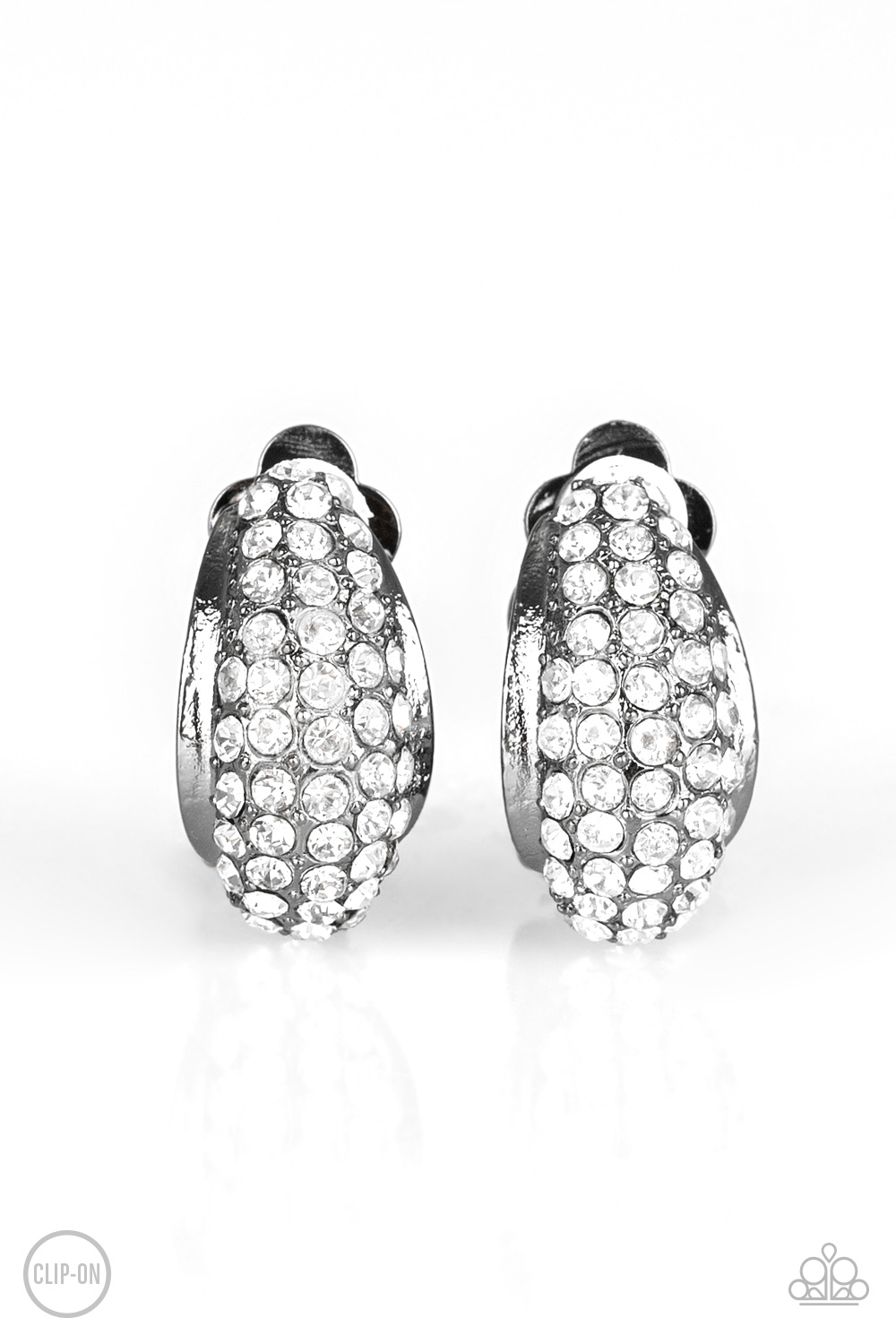 A glistening gunmetal frame is encrusted in row after row of glassy white rhinestones for a timeless look. Earring attaches to a standard clip-on fitting.