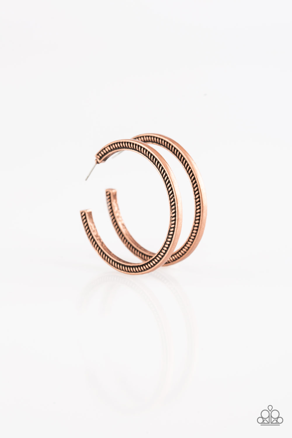Radiating with tactile textures, a glistening copper hoop curls around the ear for a tribal inspired look. Earring attaches to a standard post fitting. Hoop measures 2" in diameter.
