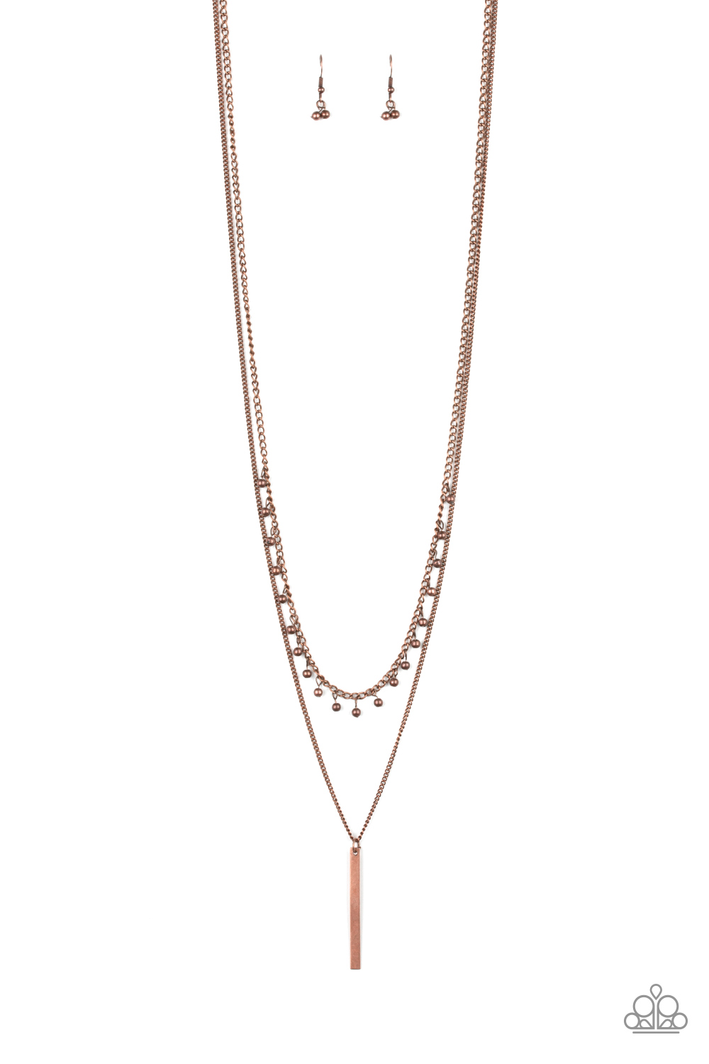 Two mismatched copper chains layer down the chest. Dainty copper beads dangle from the bottom of the uppermost chain, while a rectangular pendulum-like pendant swings from the lowermost chain for a causal finish. Features an adjustable clasp closure.