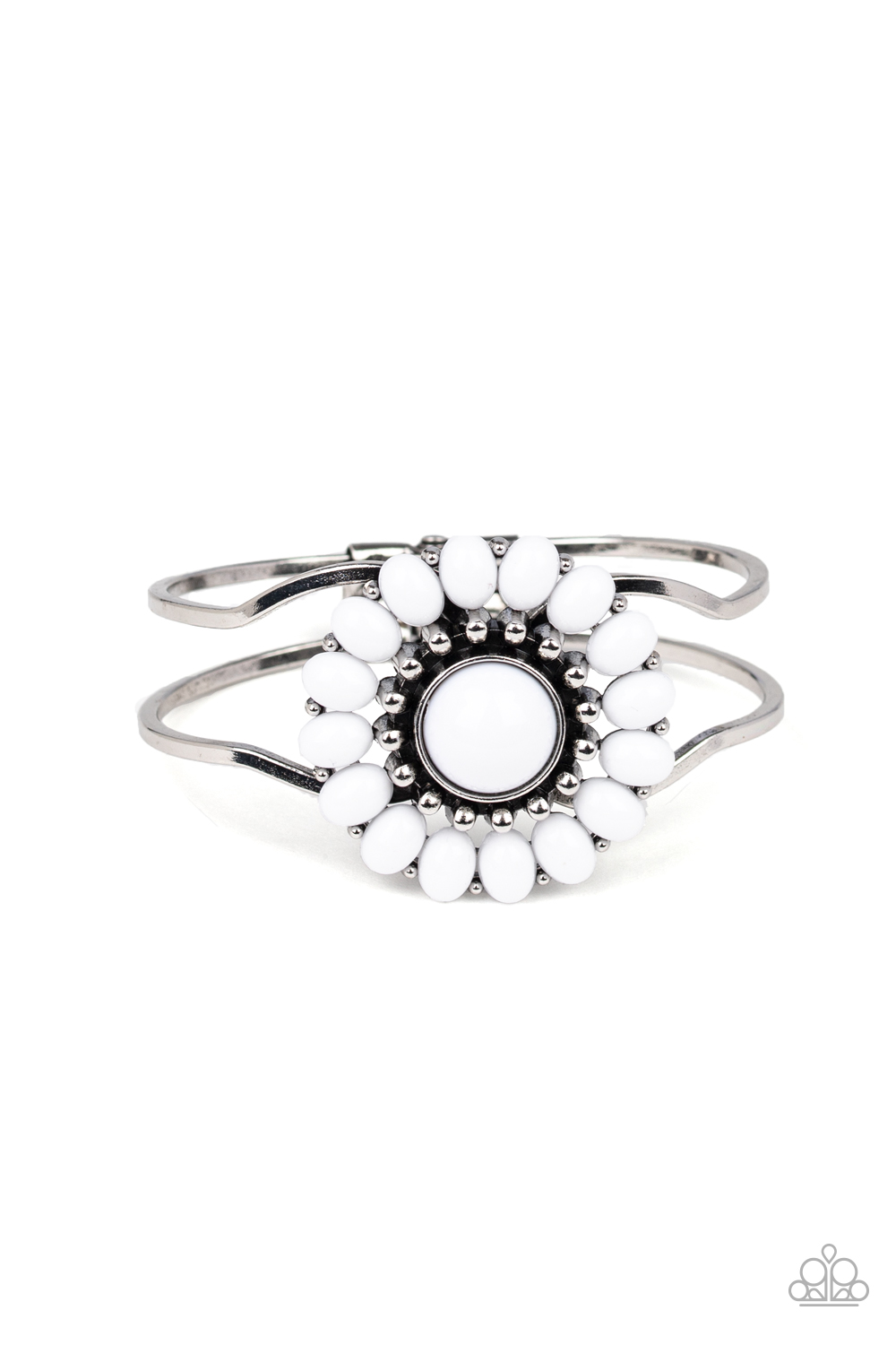 Dotted with dainty silver studs and polished white beads, a colorful floral frame adorns the top of an airy cuff for a seasonal look. Features a hinged closure.