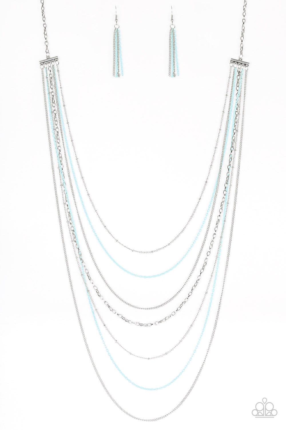 Mismatched silver chains alternate with dainty blue chains down the chest, creating a colorful industrial look. Features an adjustable clasp closure.