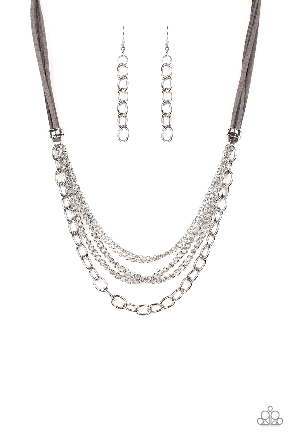 Suspended between strips of earthy gray suede, mismatched strands of silver layer below the collar for a spunky industrial look. Features an adjustable clasp closure.