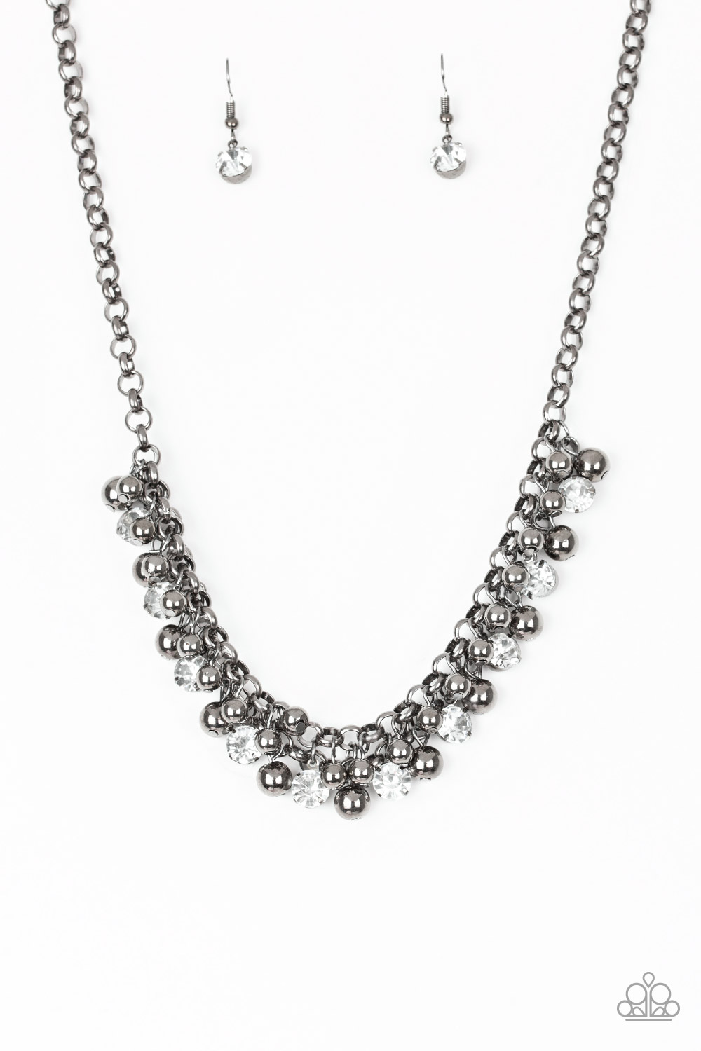 Classic gunmetal beads and oversized white rhinestones trickle from the bottom of interlocking gunmetal chains, creating a fierce fringe below the collar. Features an adjustable clasp closure.