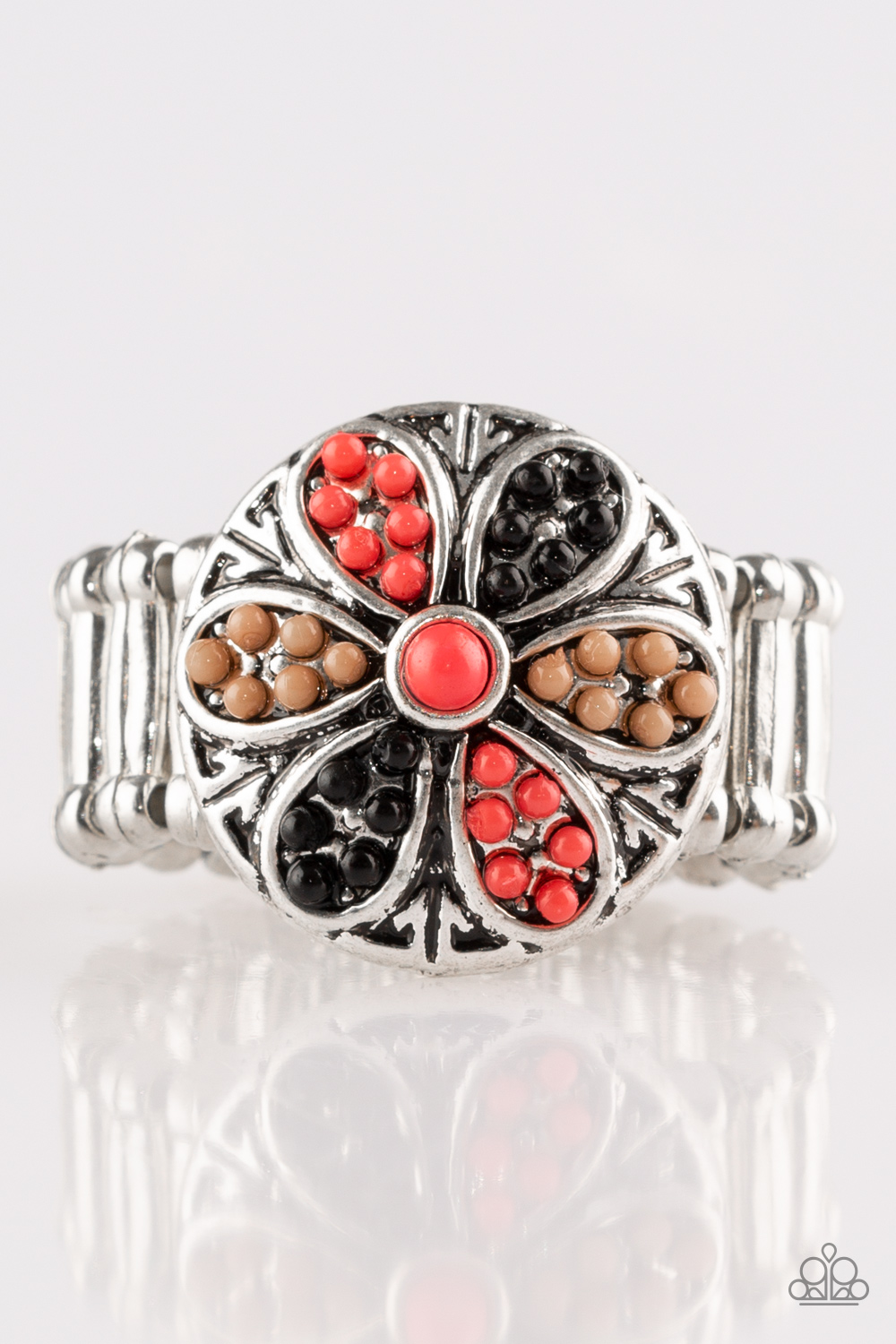 Dainty brown, black, and coral beads adorn the petals of a whimsical floral centerpiece for a seasonal look. Features a stretchy band for a flexible fit.