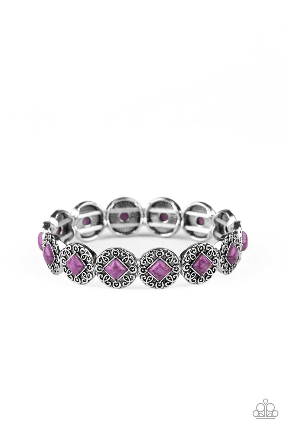 Featuring square purple stone centers, ornate silver frames are threaded along a stretchy band around the wrist for a seasonal flair.