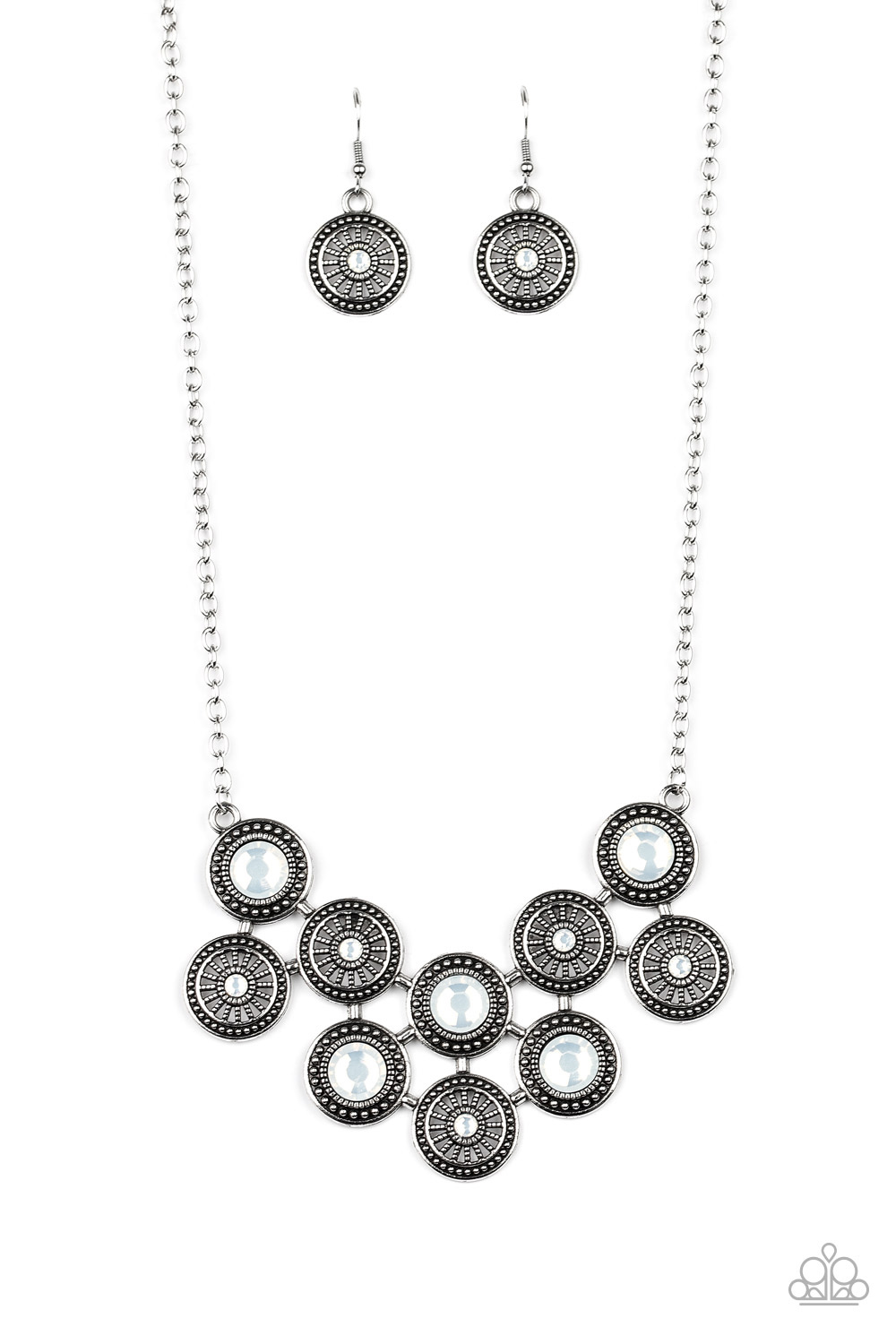 A collection of opalescent white gems dot the centers of studded silver frames that connect into a starry centerpiece below the collar. Features an adjustable clasp closure.