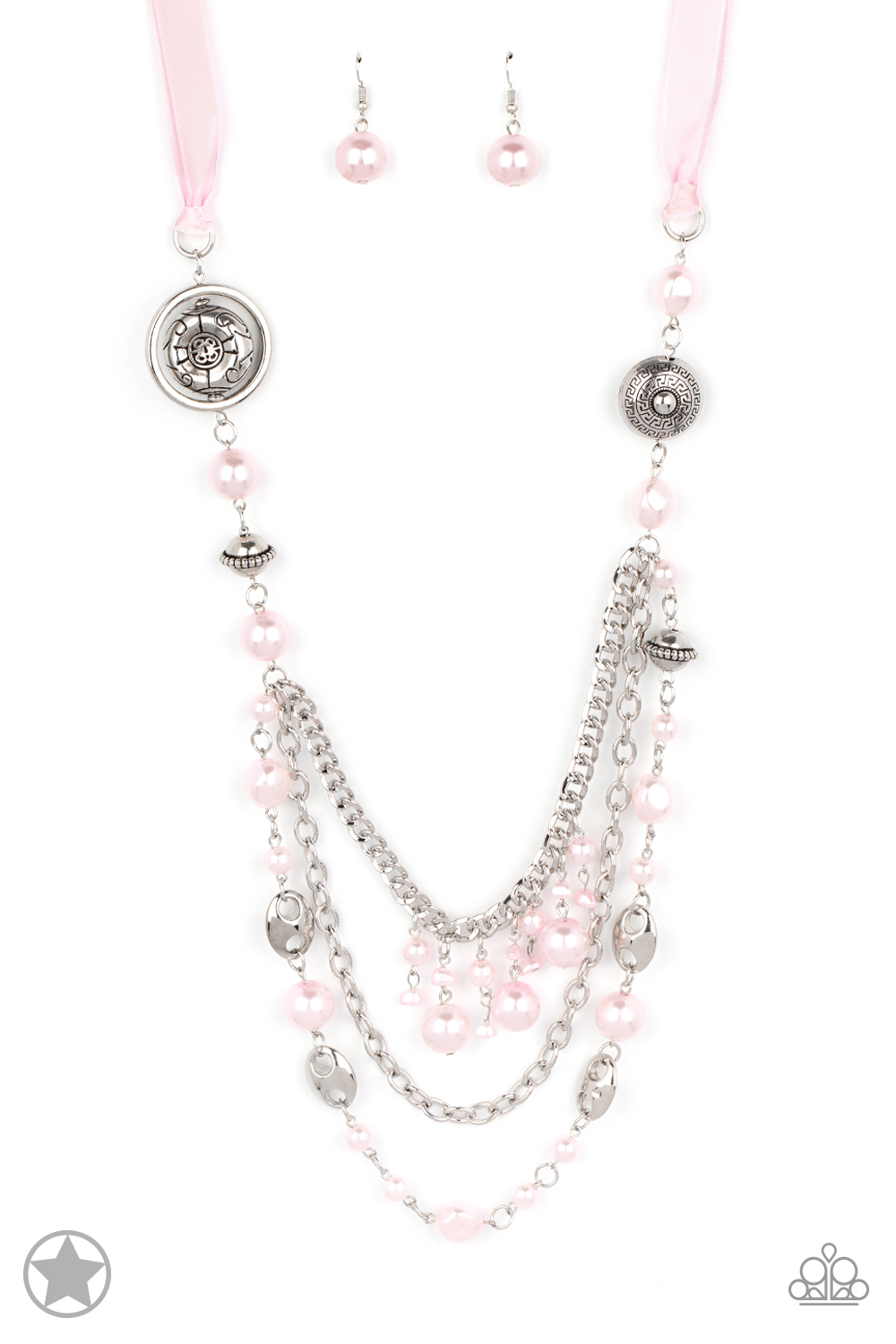 A silky pink ribbon replaces a traditional chain to give an elegant look. Pearly pastel pink beads and funky silver pieces intermix with varying lengths of silver chains to give a fresh take on a Victorian-inspired piece.