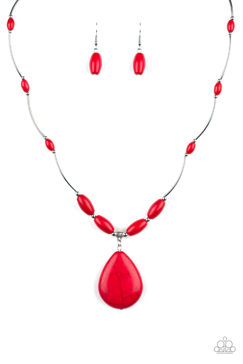 A collection of shiny silver beads and fiery red stone beads are threaded along an invisible wire below the collar. A dramatically oversized red stone teardrop pendant swings from the bottom of a seasonal flair. Features an adjustable clasp closure.