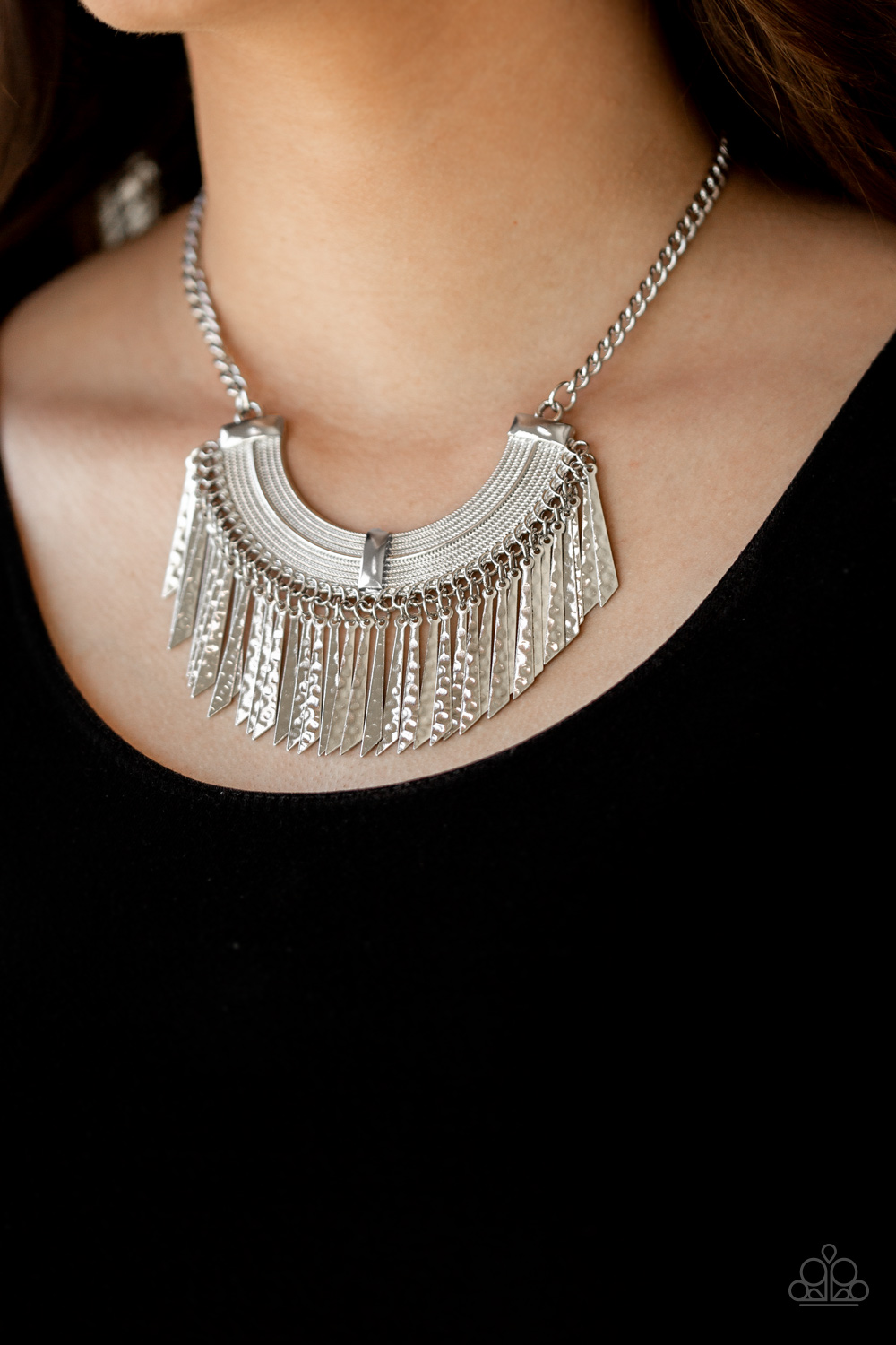 Hammered in shimmery textures, flared silver plates swing from the bottom of an ornate half-moon frame, creating an edgy fringe below the collar. Features an adjustable clasp closure.
