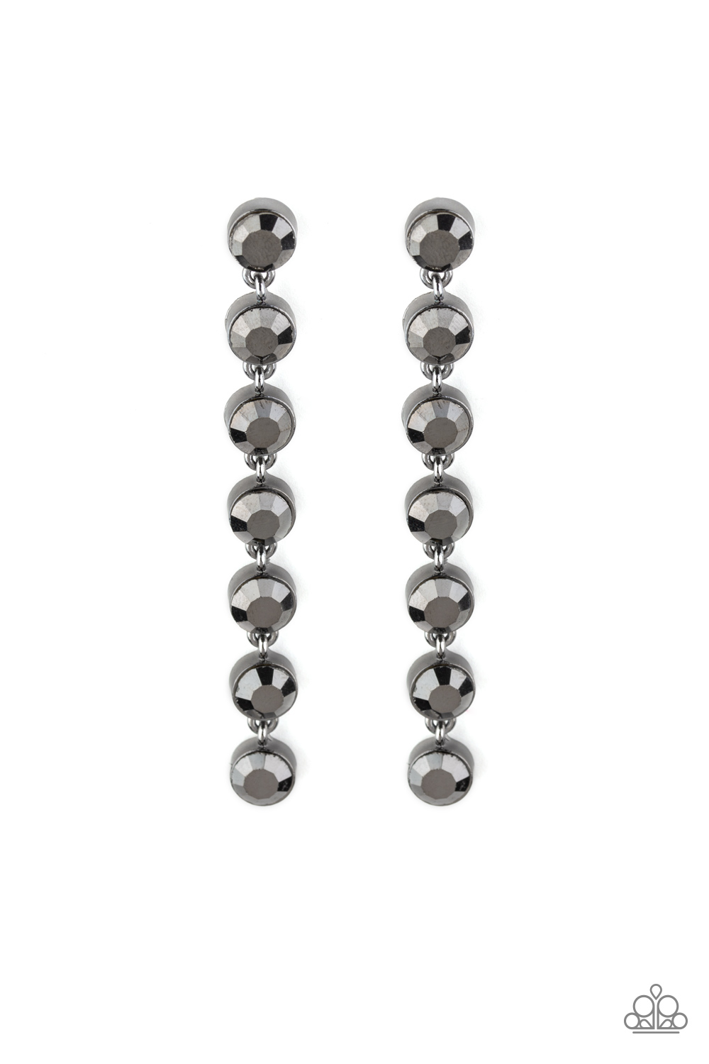 Featuring sleek gunmetal fittings, a collection of oversized hematite rhinestones drip from the ear for a glamorous look. Earring attaches to a standard post fitting.