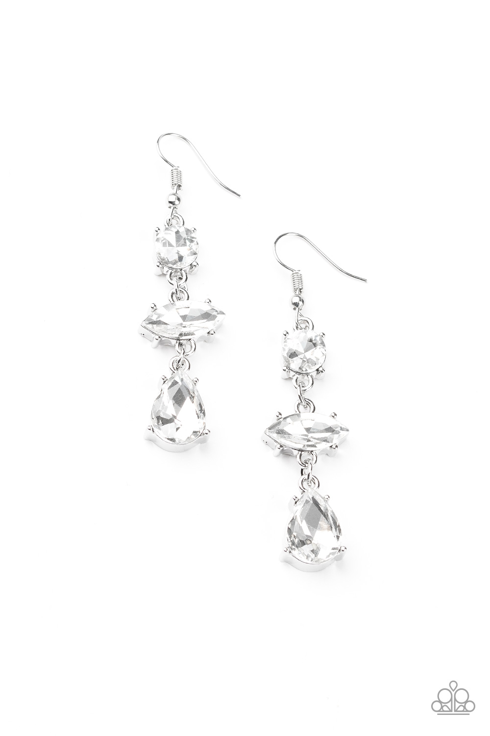 A round rhinestone, marquise-cut gem, and glittery teardrop rhinestone dangle from ear, coalescing into an elegantly stacked lure. Earring attaches to a standard fishhook fitting.