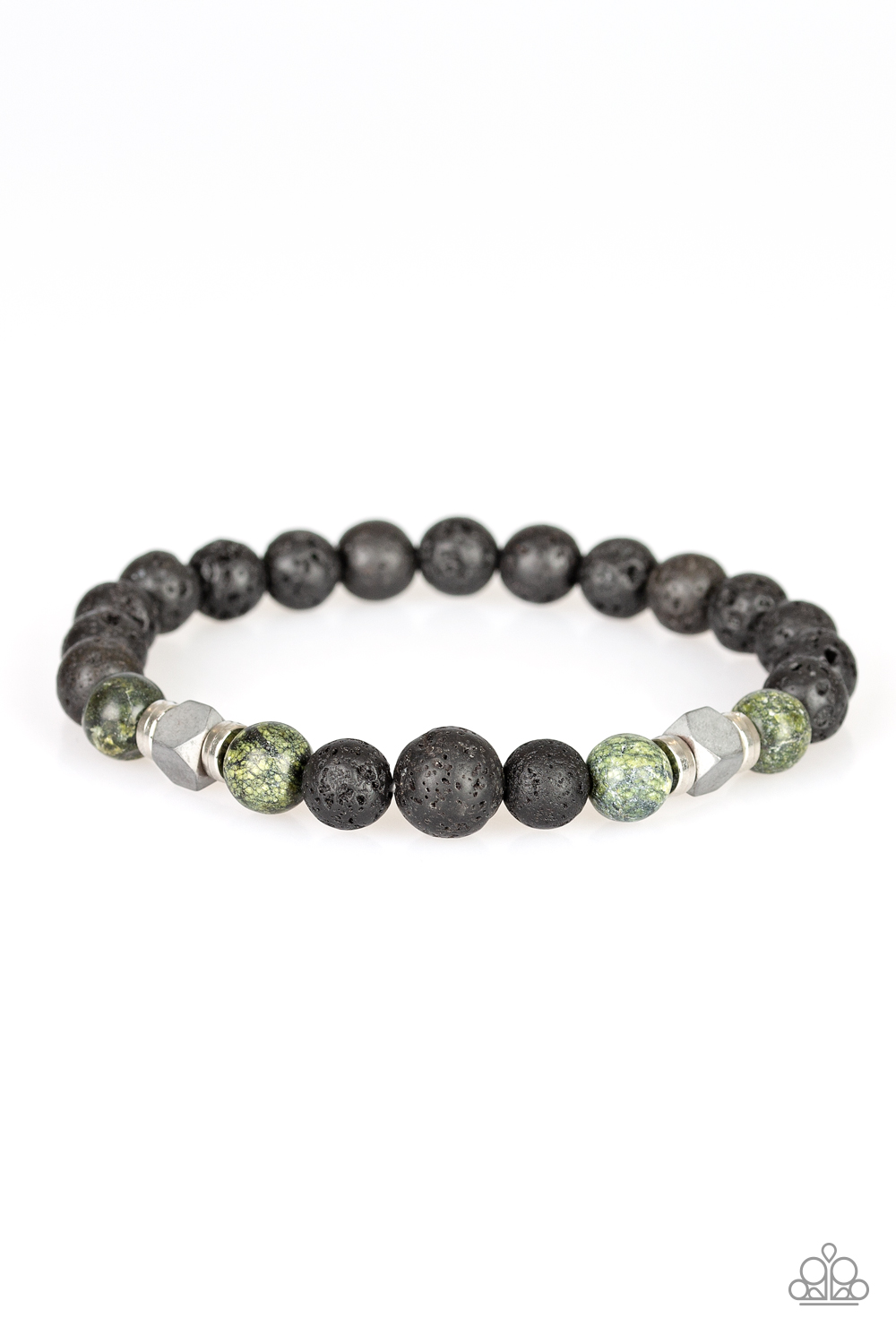 Infused with dainty silver accents, a collection of faceted cube beads, refreshing green stone beads, and earthy lava rock beads are threaded along a stretchy band around the wrist for a seasonal look.