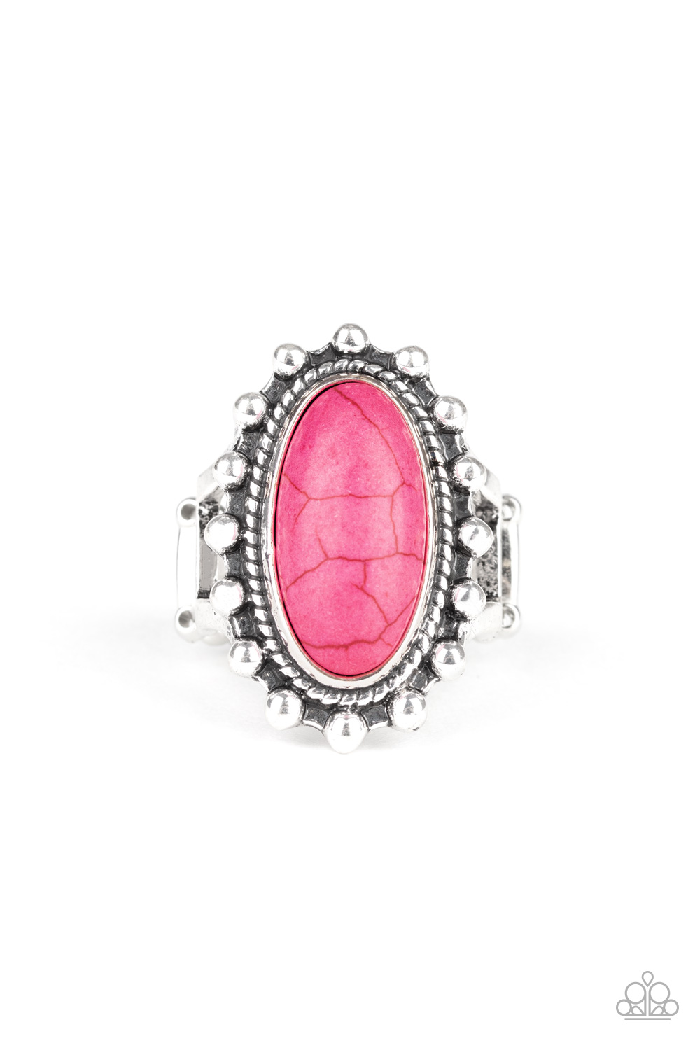 An oval pink stone is pressed into the center of a studded silver frame, creating a rustic centerpiece atop the finger. Features a stretchy band for a flexible fit.
