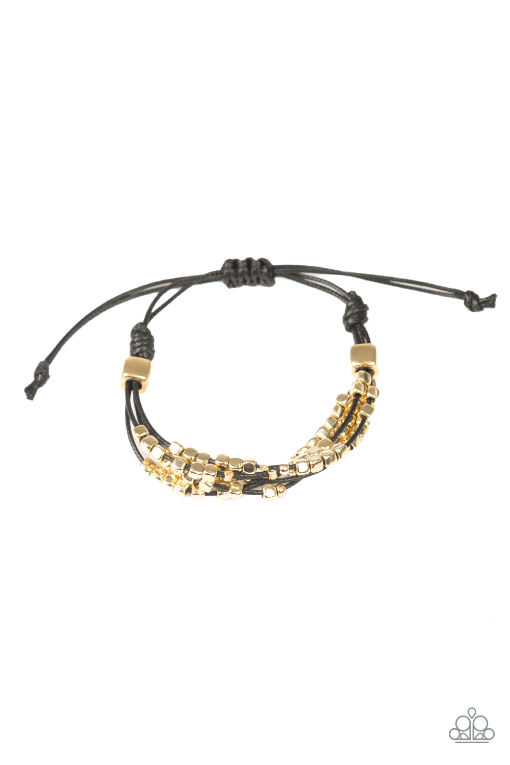 A collection of dainty gold beads and glistening gold cubes are threaded along strands of shiny black cording around the wrist for a minimalist inspired look. Features an adjustable sliding knot closure.