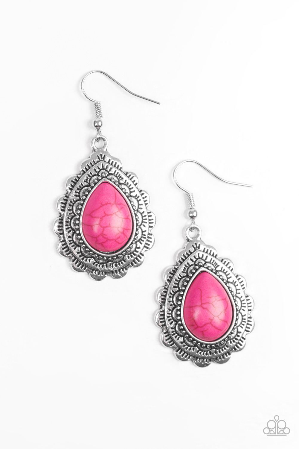 Chiseled into a tranquil teardrop, a vivacious pink stone is pressed into the center of a scalloped silver frame stamped in tribal inspired textures for a seasonal look. Earring attaches to a standard fishhook fitting.