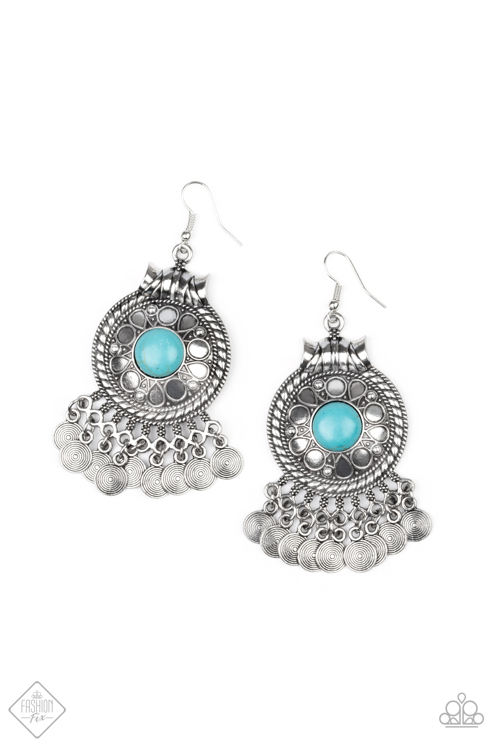 A polished turquoise stone is pressed into the center of a silver frame stamped in seasonal floral patterns. Textured silver discs dangle from the bottom of the frame, creating a whimsical fringe. Earring attaches to a standard fishhook fitting.
