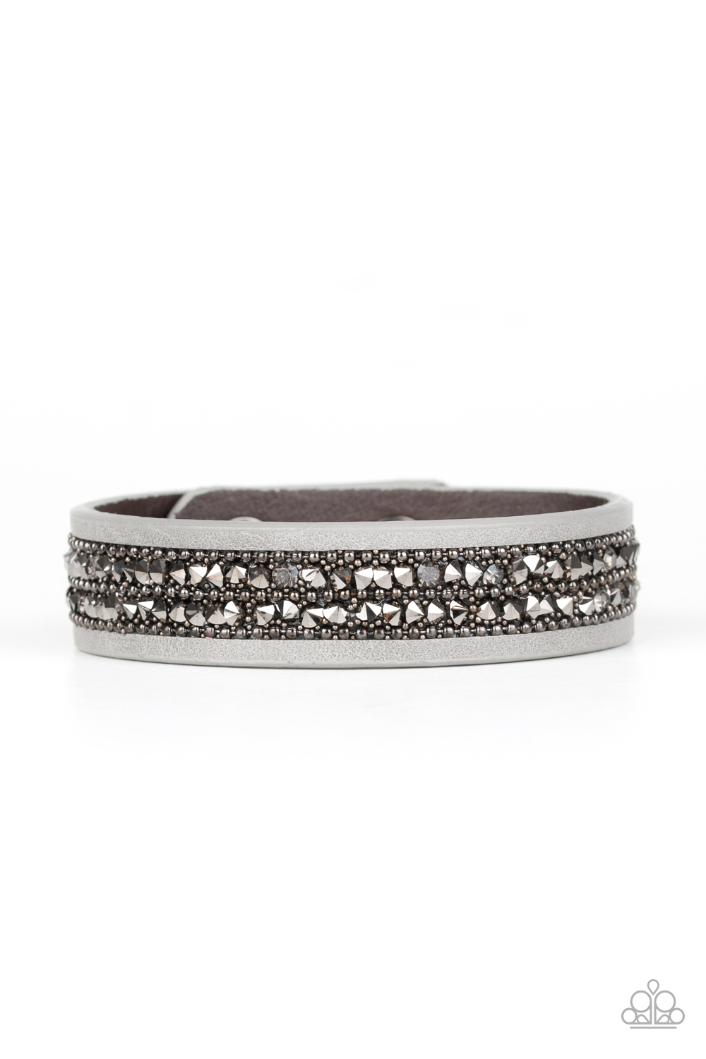 The center of a skinny gray leather band is encrusted in alternating rows of glistening gunmetal ball chains and glittery prism rhinestones for a sassy look. Features an adjustable snap closure.
