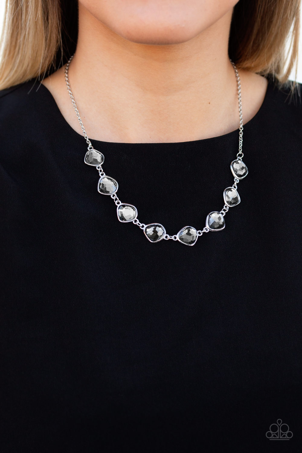 Featuring shimmery silver frames, imperfect smoky gems link below the collar for a glamorous vintage inspired look. Features an adjustable clasp closure.