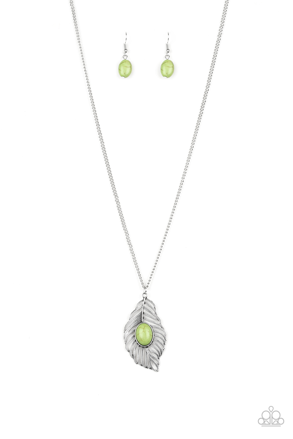 A refreshing green stone is pressed into the center of an airy silver feather rippling with lifelike textures. The whimsical pendant swings from the bottom of a lengthened chain for a seasonal finish. Features an adjustable clasp closure.