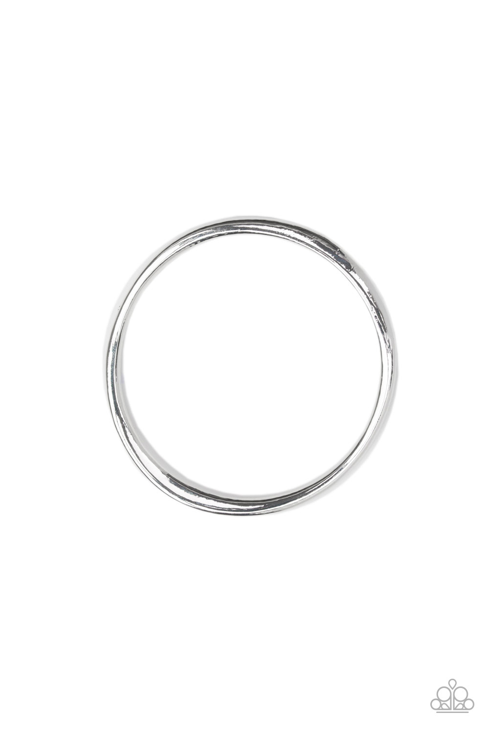 Featuring a warped surface, an asymmetrical shiny silver bangle slides along the wrist for an edgy look.