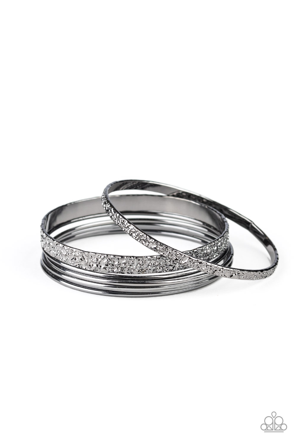 Brushed in a high-sheen shimmer, a collection of smooth and heavily hammered gunmetal bangles slides up and down the wrist for an edgy stacked look.