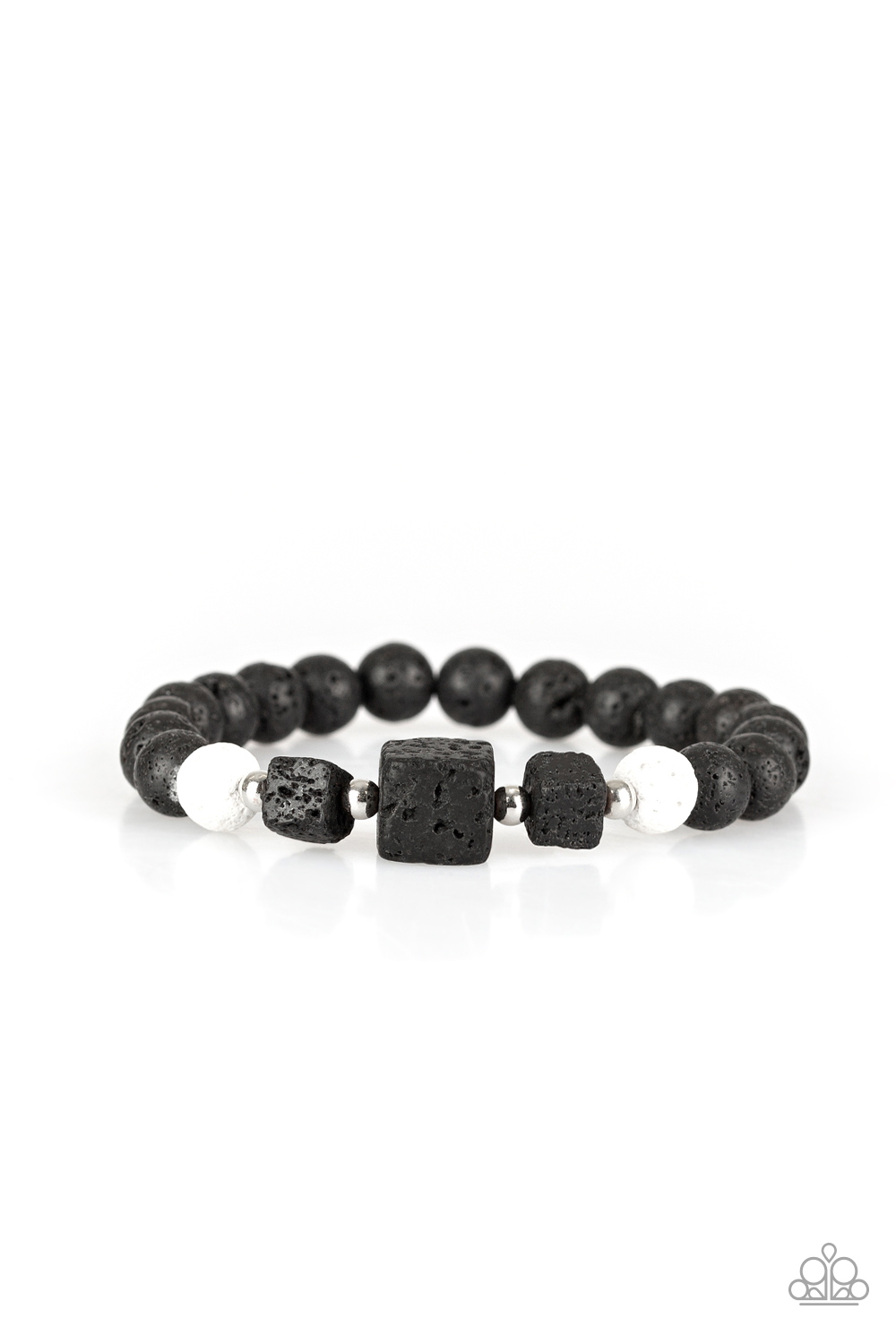 A collection of round black and white lava rocks join block-shaped lava rock beads along a stretchy band around the wrist for a seasonal look.
