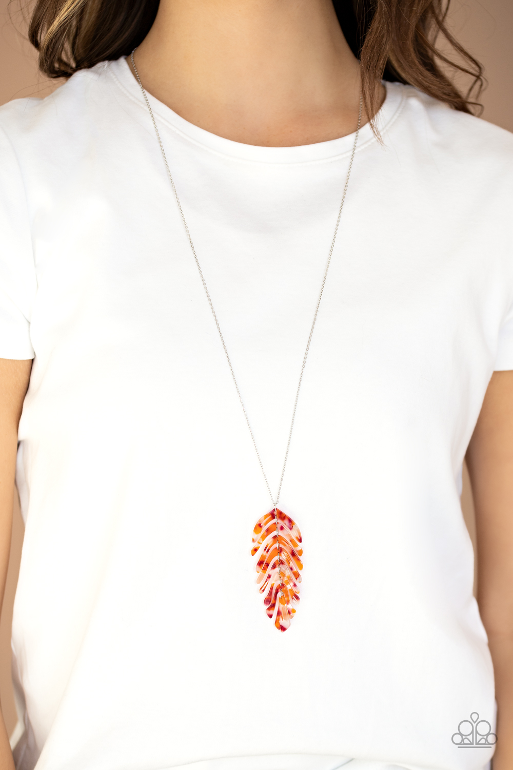 Featuring a shell-like shimmer, dainty red and orange acrylic frames link into a whimsically stacked feather pendant at the bottom of a lengthened silver chain. Features an adjustable clasp closure.