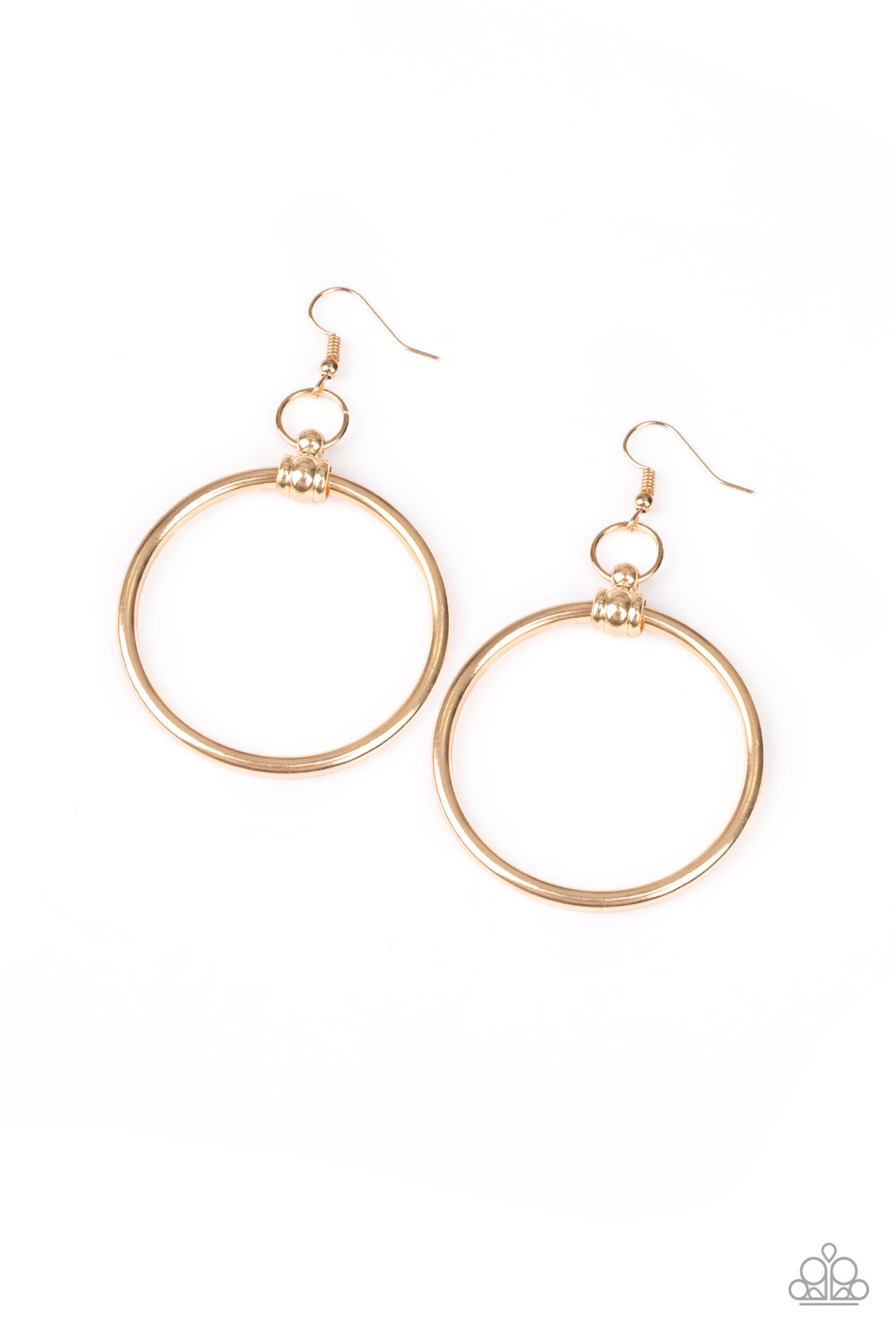 A thick gold ring is threaded through the center of an ornate gold fitting, creating a refined hoop. Earring attaches to a standard fishhook fitting.