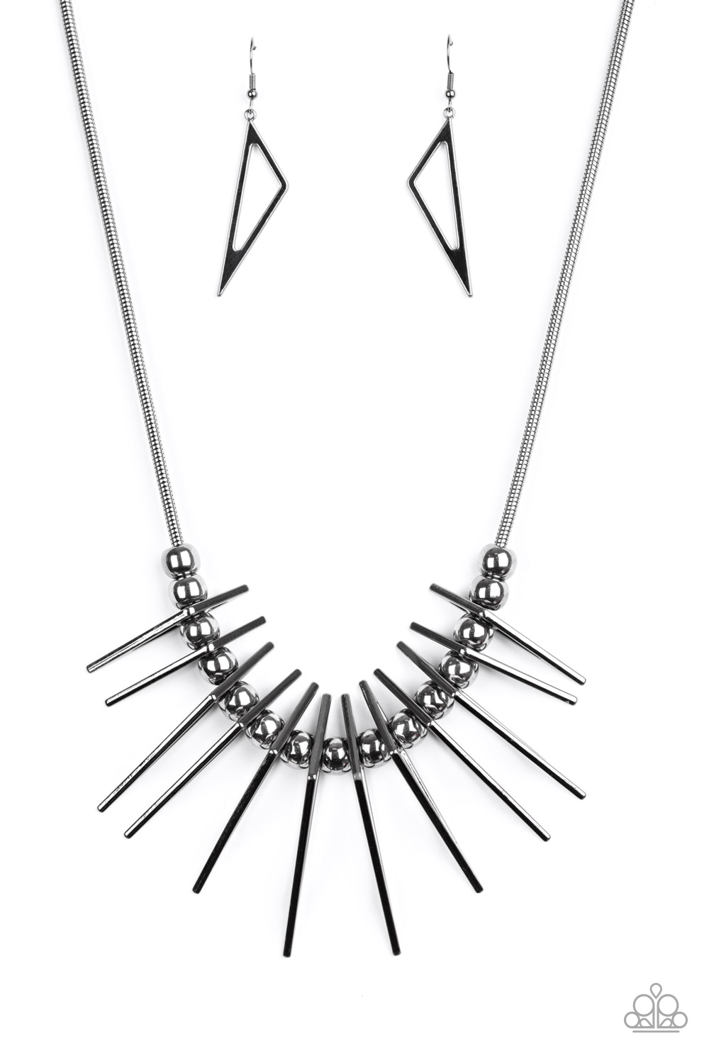 Separated by bold gunmetal beads, triangular gunmetal frames gradually increase in intensity as they slide along a rounded gunmetal snake chain, creating an edgy fringe below the collar. Features an adjustable clasp closure.