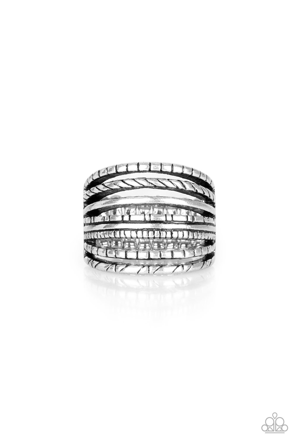 A collection of smooth and textured silver bars arc across the finger, stacking into a thick layered band. Features a stretchy band for a flexible fit.