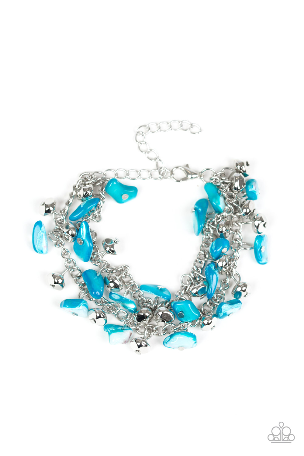 Two strands of refreshing blue pebbles and faceted silver beads swing from two layered chains, creating a colorful fringe around the wrist. Features an adjustable clasp closure.