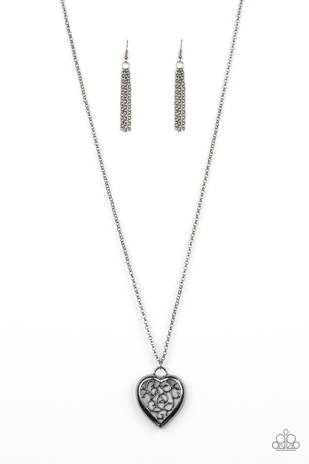 Featuring vine-like filigree, a dramatic locket-like heart swings from the bottom of a lengthened gunmetal chain for a vintage inspired look. Features an adjustable clasp closure.