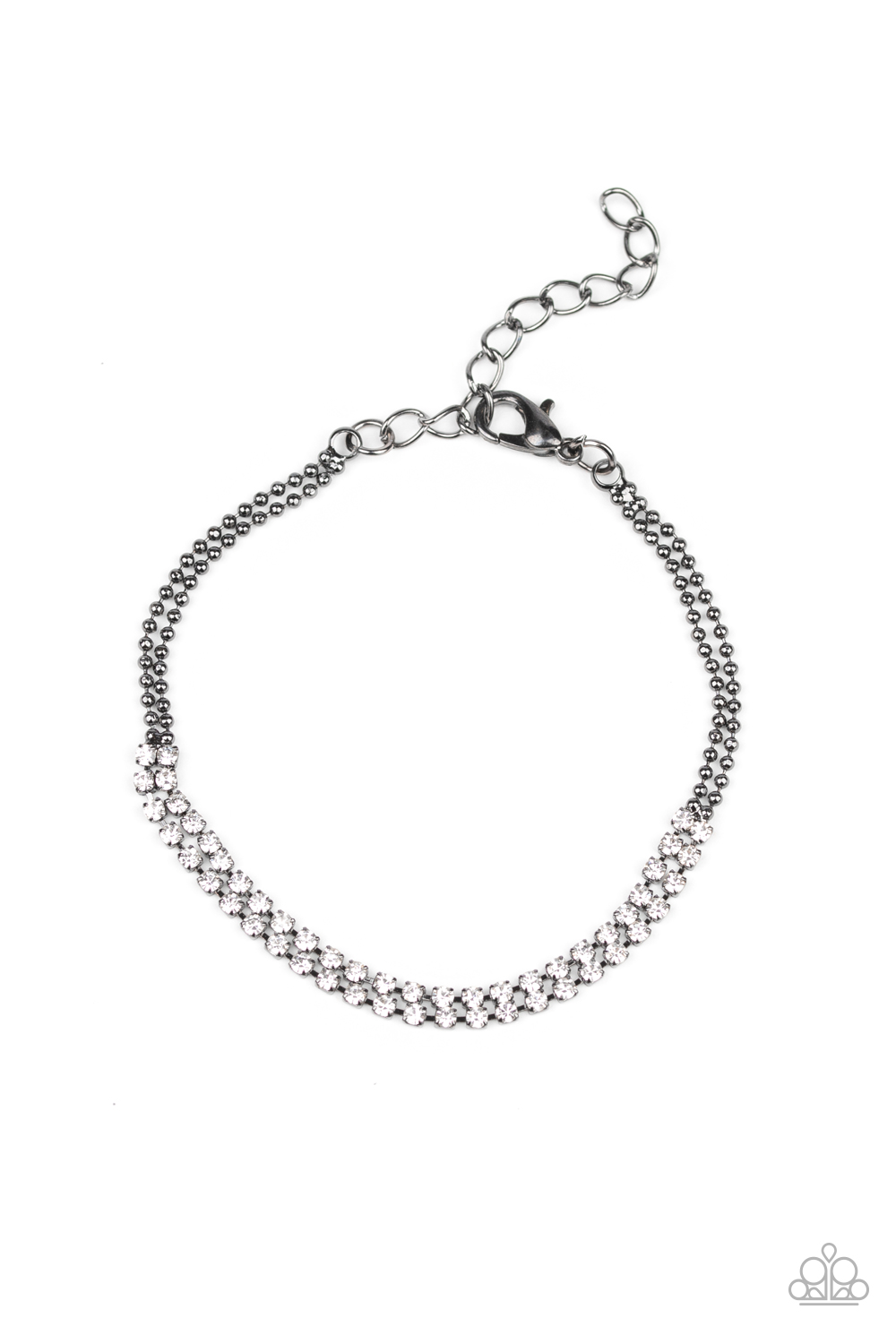 Delicately coalescing into a solitaire centerpiece, two dainty gunmetal ball chains attach to two rows of glassy white rhinestones across the wrist for a timeless look. Features an adjustable clasp closure.
