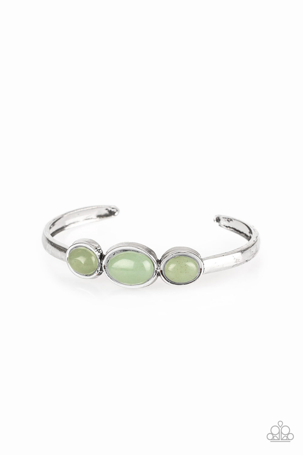 Glassy green stones are encrusted across the middle of a dainty silver cuff for a seasonal flair. As the stone elements in this piece are natural, some color variation is normal.