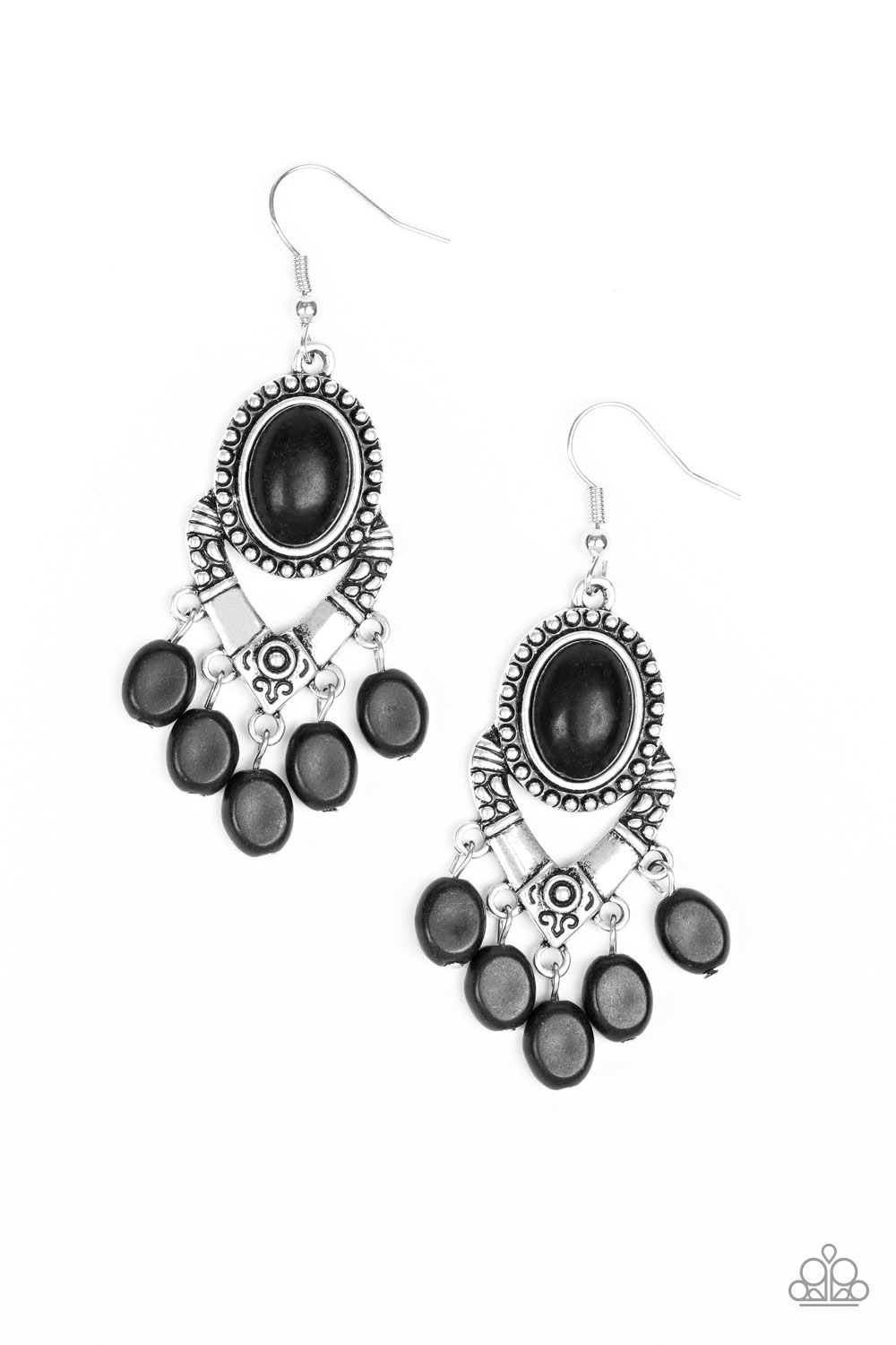 An earthy black stone is nestled inside a studded silver frame radiating with tribal inspired patterns. A matching stone fringe swings from the bottom for a seasonal finish. Earring attaches to a standard fishhook fitting.