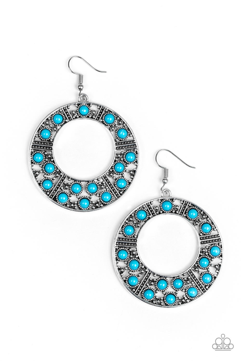 Refreshing blue beads are sprinkled across a shimmery silver hoop radiating with dainty silver studs, creating a whimsical frame. Earring attaches to a standard fishhook fitting.