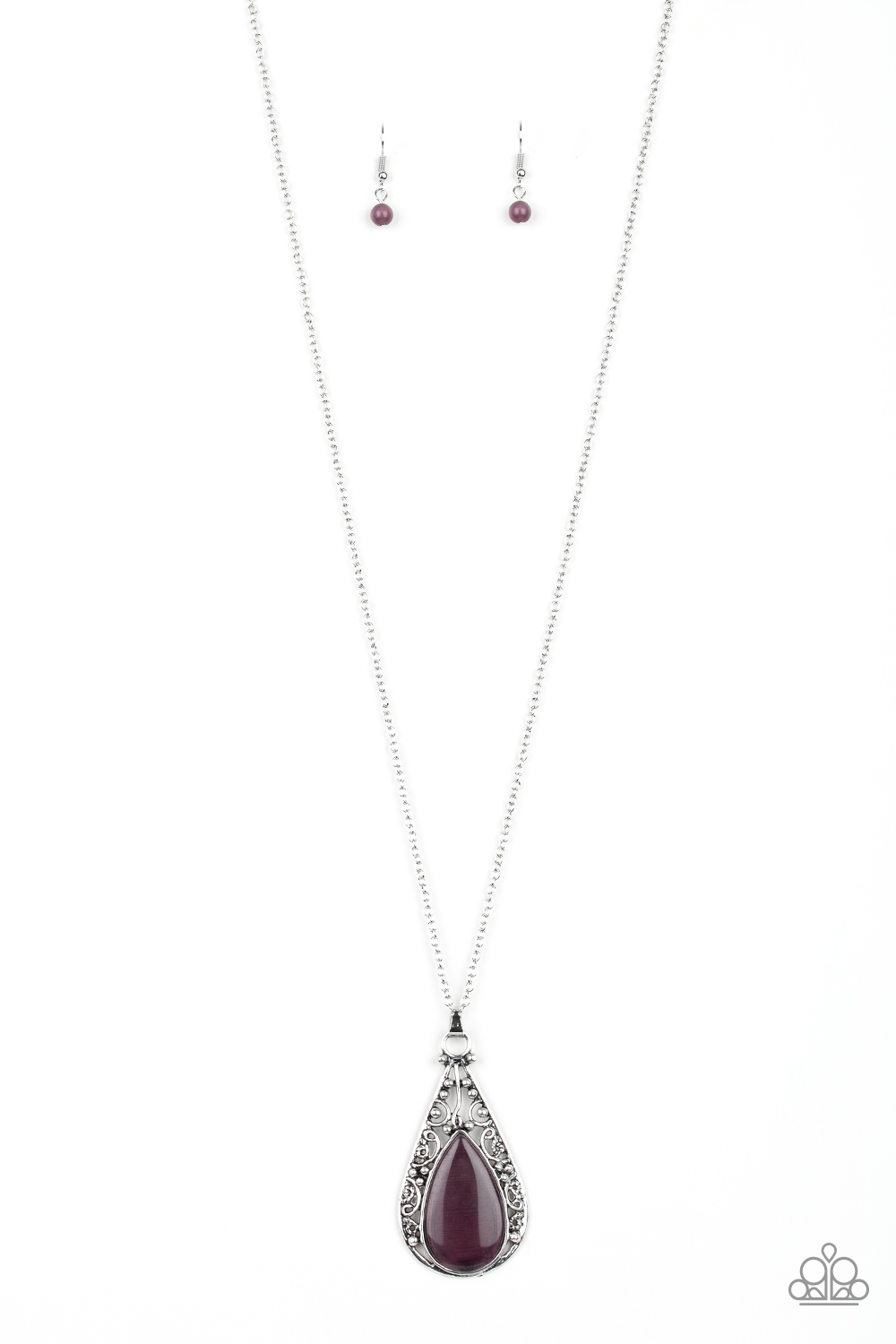 A teardrop purple cat's eye stone is pressed into a frilly silver frame radiating with vine-like filigree. The whimsical pendant swings from the bottom of a lengthened silver chain for a seasonal finish. Features an adjustable clasp closure.