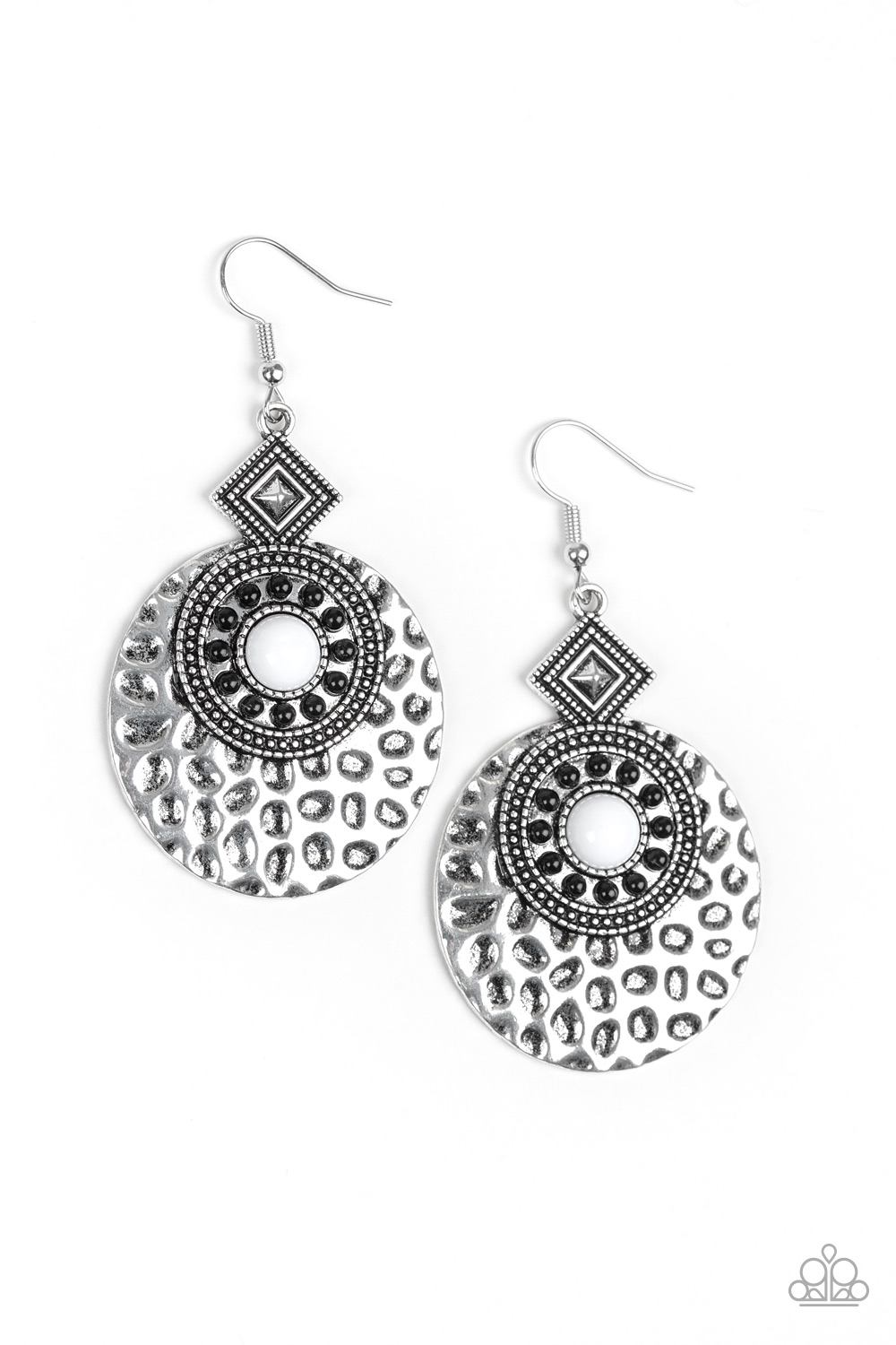 Brushed in a high-sheen silver finish, a hammered geometric frame is dotted in black and white beads for a colorful tribal inspired look. Earring attaches to a standard fishhook fitting.