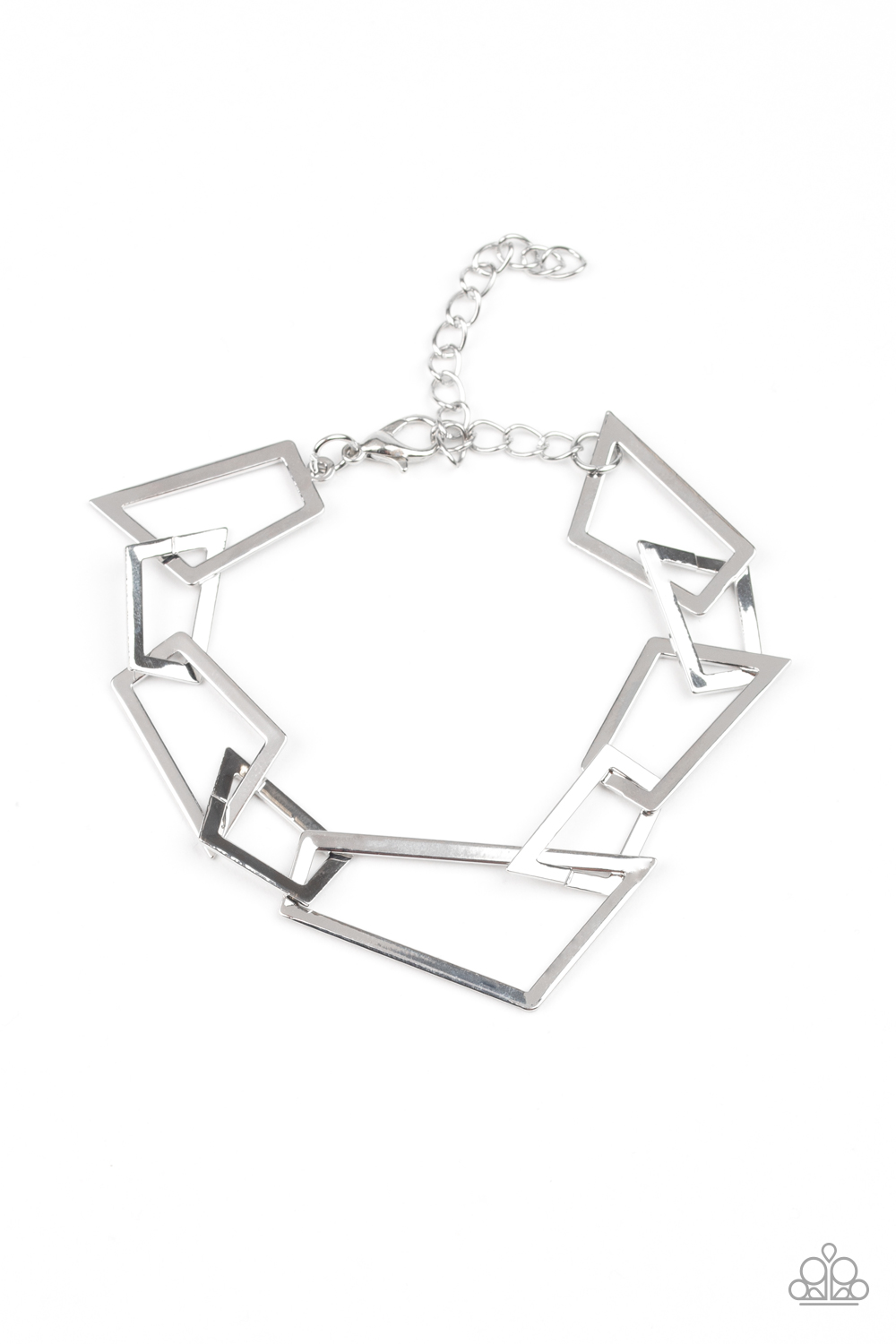 An edgy collection of trapezoid-like silver frames link around the wrist, creating a bold industrial display. Features an adjustable clasp closure.