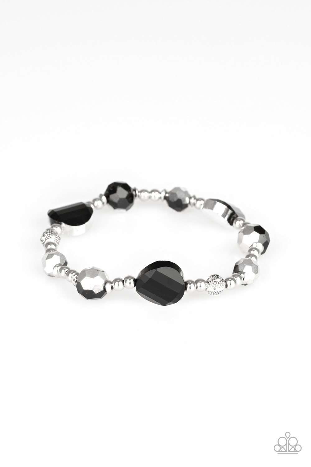 Brushed in a metallic shimmer, a collection of glittery black beads and shiny silver beads are threaded along a stretchy band around the wrist for a refined look.