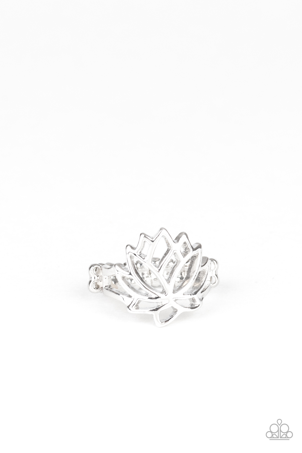 Dainty silver bars delicately climb the finger, blooming into a whimsical lotus centerpiece. Features a dainty stretchy band for a flexible fit.
