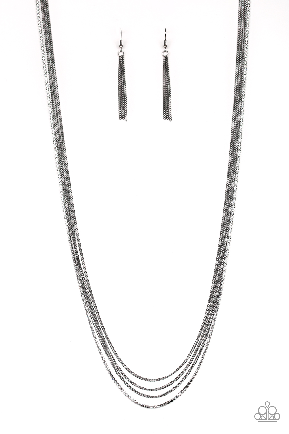 Featuring sleek square fittings, a glittery strand of white rhinestones joins dainty rows of glistening gunmetal chains down the chest for a refined flair. Features an adjustable clasp closure.