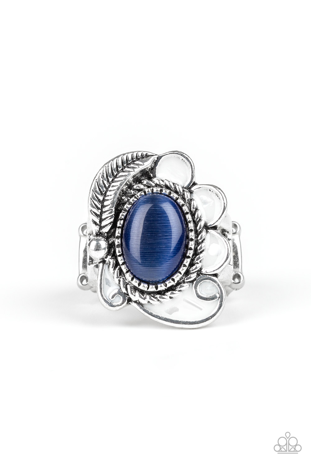 A glowing blue cat's eye stone is pressed into the center of a shimmery silver frame radiating with a silver feather and glistening white petals, creating a whimsical compilation atop the finger. Features a stretchy band for a flexible fit.