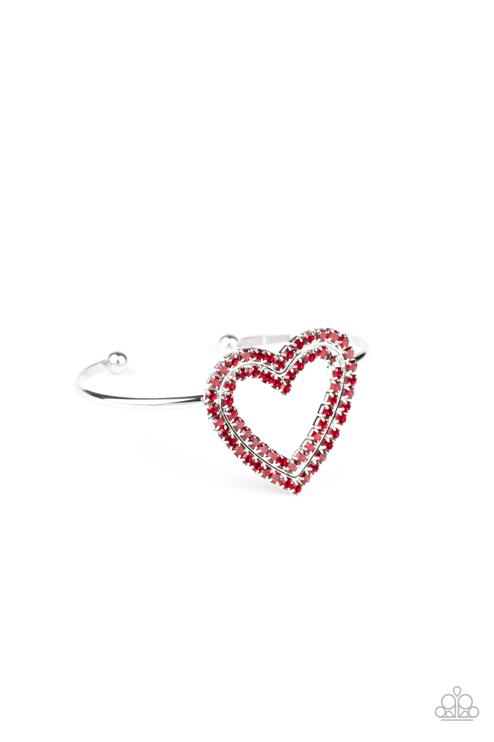 Two rows of glittery red rhinestones stack into a sparkling heart atop a dainty silver cuff for a charming look.